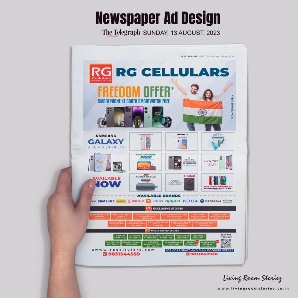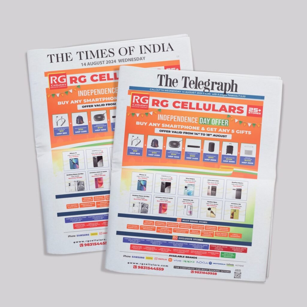 Newspaper design posters are created to align with RG Cellulars’ print advertising campaigns in local or national newspapers. These designs focus on clear communication, typically incorporating promotional messages, product highlights, or event announcements. The goal is to create an informative, concise, and visually appealing design that stands out in a crowded print space. We have designed newspaper posters for AajKaal, Calcutta Times, Anandabazar Patrika, The Telegraph, and The Times of India.